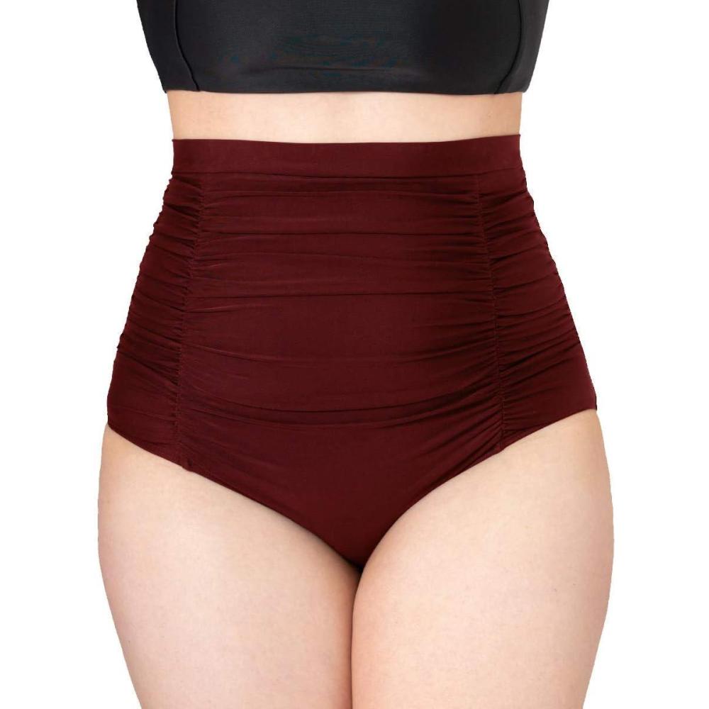 SHAPERMINT Women Ruched High Waisted Bikini Bottom Swimsuit, Tummy Control Full Coverage Swimwear, Small to Plus Size(Burgundy)